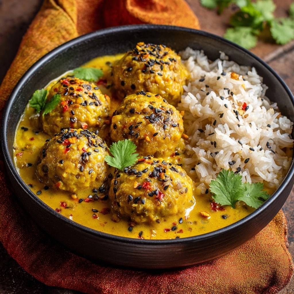Stell dir vor, du beißt in eine sesamknusprige Spinat-Kofta, die innen saftig bleibt und außen perfekt goldbraun ist. Die goldene Kokoscurry-Sauce umhüllt sie cremig, mit einem Hauch von Kurkuma und Chili, die auf der Zunge prickeln. Ich hab jahrelang mit zerfallenden Koftas gekämpft – diese Dinger platschen immer in der Sauce auseinander, oder? Bis ich den doppelten Bindetrick gefunden hab: Kichererbsenmehl saugt Feuchtigkeit und der Sesam-Anbraten schafft eine schützende Kruste.