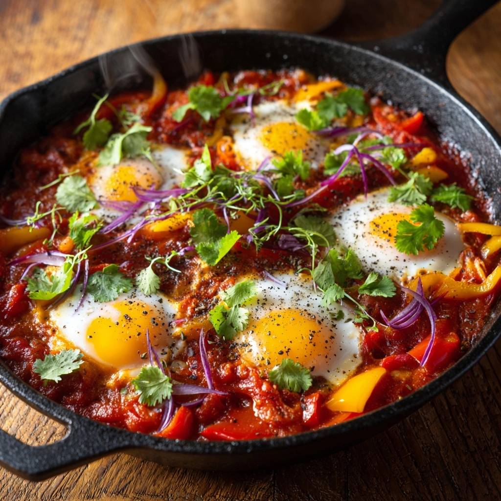 Stell dir vor, der Duft von karamellisierten Paprika und Zwiebeln steigt auf. Die Sauce klebt am Löffel, die Eier sitzen perfekt darin. Jeder Bissen explodiert vor Geschmack, das Dotter läuft aus, und du tunkst Brot rein, bis nichts mehr übrig ist. Das ist Shakshuka keine wässrige Soße – dick, würzig, brunch-perfekt.