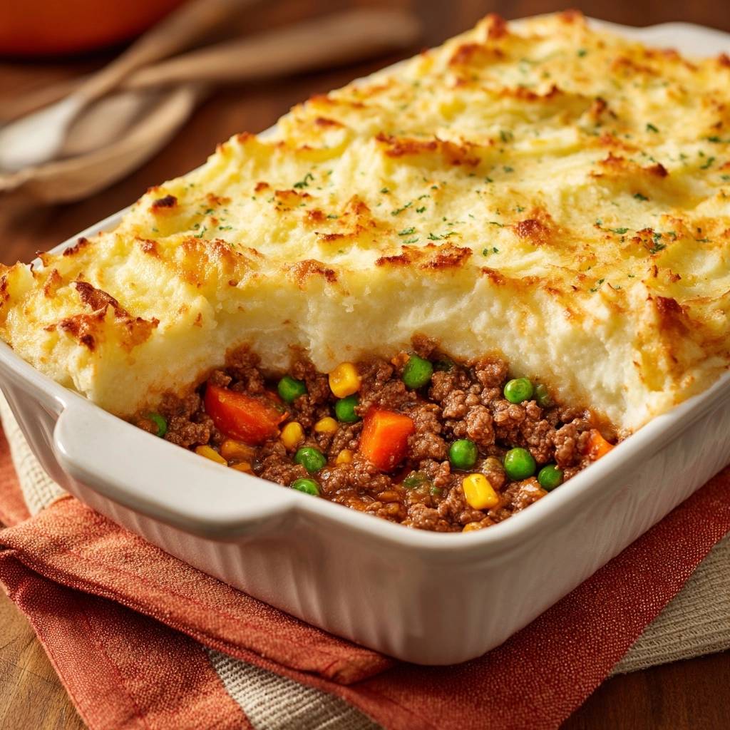 Stell dir vor, du schaufelst die Gabel in diesen Shepherd’s Pie, und die Kruste knackt so herrlich knusprig, dass du fast die Zähne zusammenbeißen musst. Darunter wartet saftiges Hackfleisch mit süßen Karotten, knackigen Erbsen und Mais, alles umhüllt von cremigem Kartoffelpüree. Der Duft von gebratenem Fleisch und Thymian zieht durch die Küche, und beim ersten Bissen explodiert der Geschmack – herzhaft, wärmend, einfach perfekt.