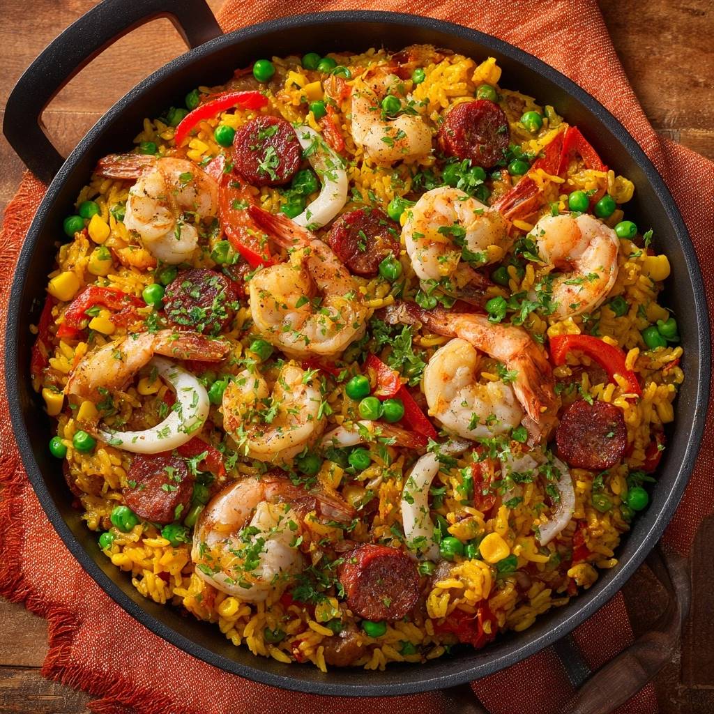 Garnelen und Calamari geben Frische. Chorizo die rauchige Tiefe. Nimm frische Meeresfrüchte für besten Geschmack.