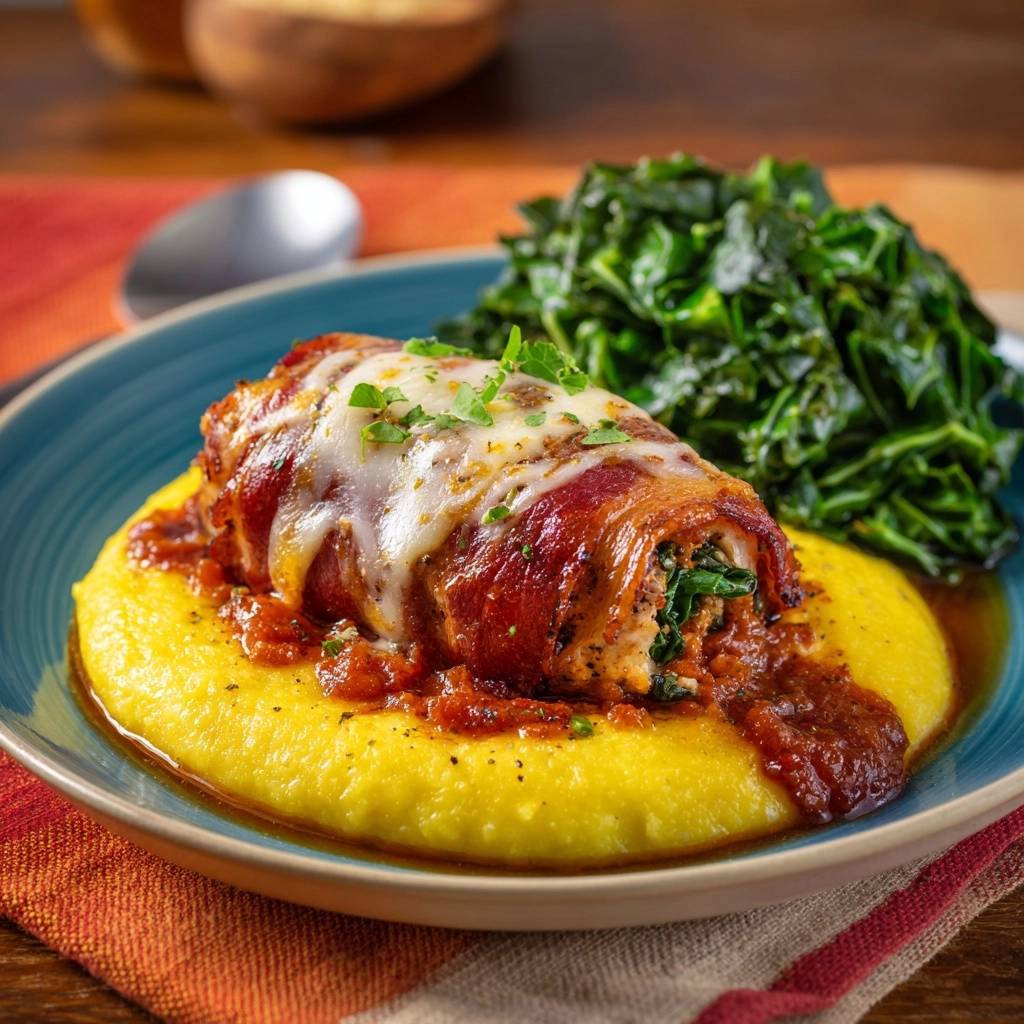 Speck-umwickeltes Hähnchen mit Spinatfüllung auf Polenta