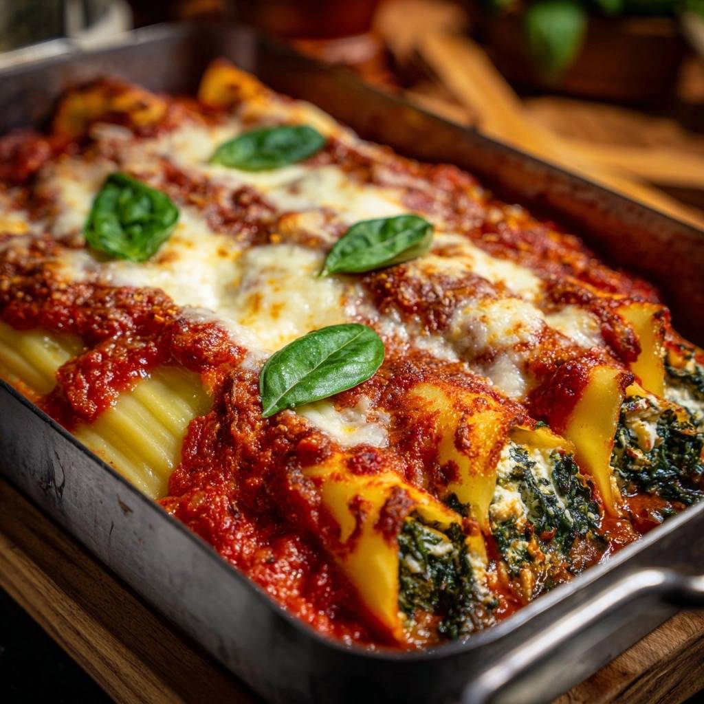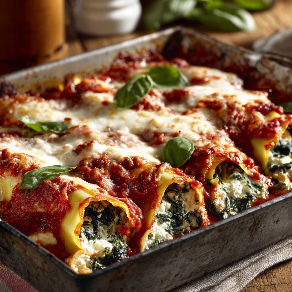 Seither back ich sie so, und sie sind immer perfekt: goldbraun außen, fluffig drin. Der Duft von Tomatensoße und Knoblauch zieht durch die Küche, und alle wollen Nachschlag. Probier’s aus, du wirst staunen, wie einfach saftige Spinat-Ricotta-Cannelloni werden.