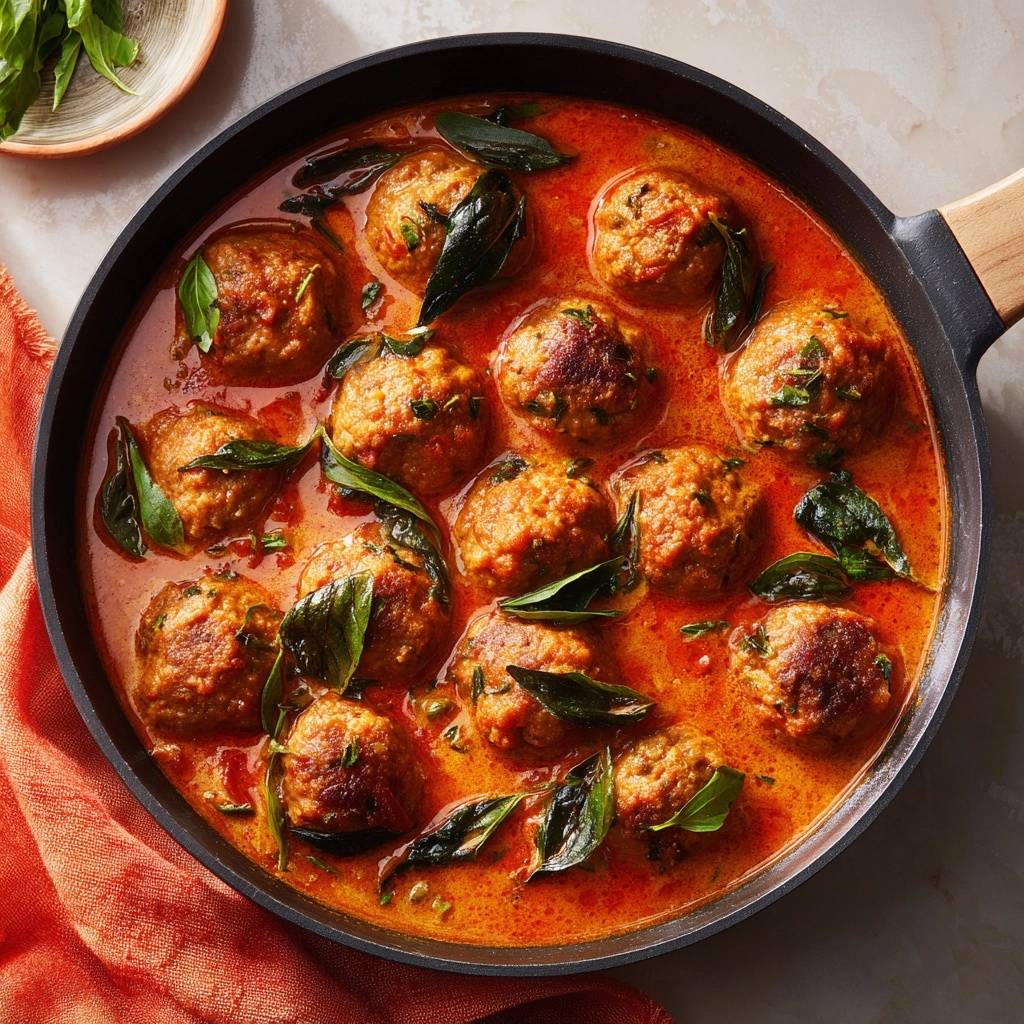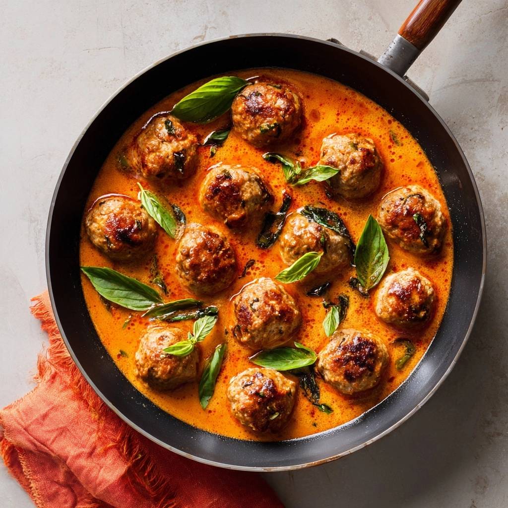 Stell dir vor, du beißt in ein thailändisches Hackbällchen, das außen knusprig ist und innen saftig schmilzt. Die cremige Rote Curry-Sauce umhüllt es mit scharfen, würzigen Noten, und Thaibasilikum haucht frische Aromen dazu. Der Duft steigt auf, als die Kokosmilch aufkocht, und plötzlich bist du in Bangkok.