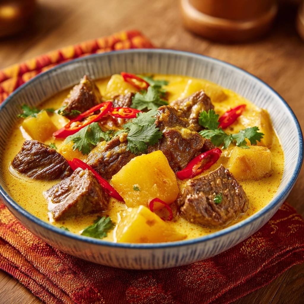 Stell dir vor, du hebst den Deckel vom Topf und ein warmer Duft von gelber Currypaste und Kokosmilch umhüllt dich. Der erste Löffel: cremig, mit zartem Rindfleisch, das wie Butter zerfällt, und Kartoffeln, die genau den richtigen Biss haben. Das ist Thailändisches Rindfleisch-Curry mit Kartoffeln, wie es sein soll.