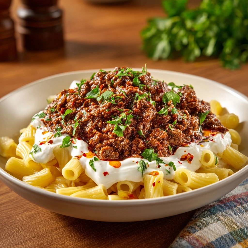 Stell dir vor, du beißt in saftige Rigatoni, die in würziger Hacksoße schwimmen. Der cremige Joghurt oben drauf schmilzt förmlich, und frische Petersilie bringt Frische rein. Das erste Mal hab ich das in Istanbul probiert, an einem lauen Abend am Straßenrand. Der Duft von gebratenem Hack und Tomaten hat mich sofort gepackt.