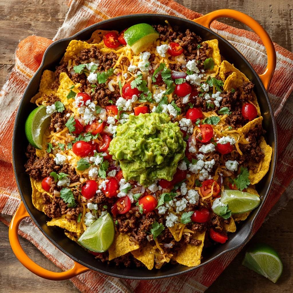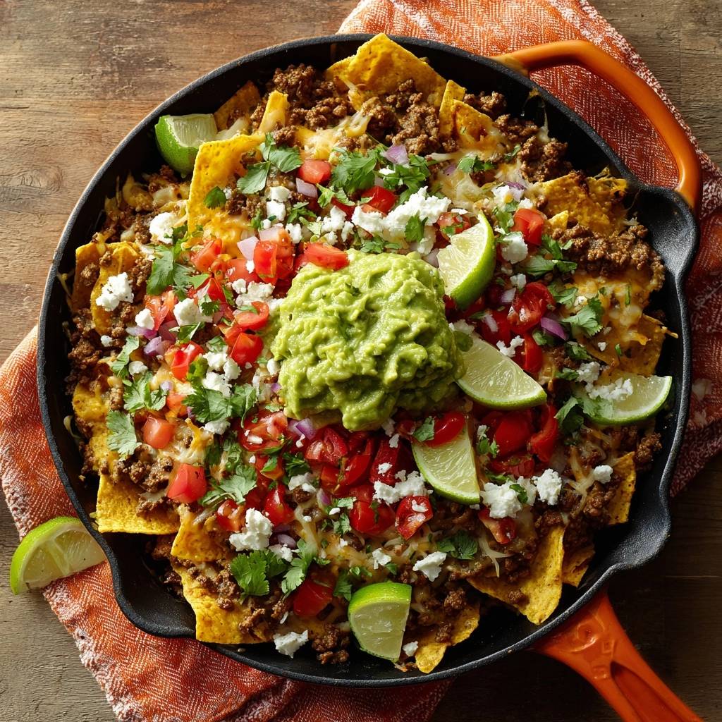 Serviere die Pfanne sofort. Nachos warten nicht. Sobald sie auf dem Tisch stehen, sollten alle zugreifen, solange der Käse noch Fäden zieht und die Basis maximalen Crunch liefert.