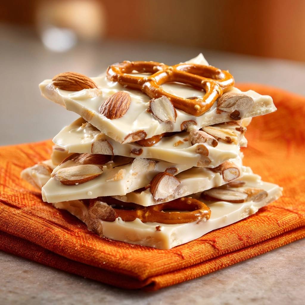 Die Mandeln duften herrlich nussig, die Brezelsticks goldig und trocken. Guss die weiße Kuvertüre drüber, kühle ab, und zack – eine Platte voller Bissfestigkeit. Das ist mein neuer Favorit für Filmabende oder als schnelles Geschenk. Du beißt rein, die Mandeln knacken, Brezeln krachen, Schoko schmilzt sanft. Nie wieder Enttäuschung!