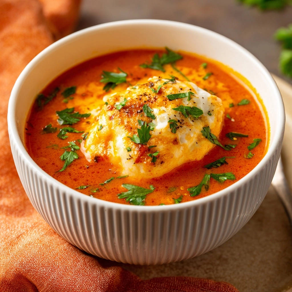 - Anrichten: Die warme Tomatensuppe in tiefe Teller füllen. Jeweils ein perfekt geformtes pochiertes Ei vorsichtig in die Mitte der Suppe setzen. Mit reichlich frisch gehackter Petersilie bestreuen und bei Bedarf noch etwas Paprikapulver und frisch gemahlenen Pfeffer über das Ei geben, wie auf dem Bild zu sehen. Sofort servieren und diesen Genussmoment zelebrieren!