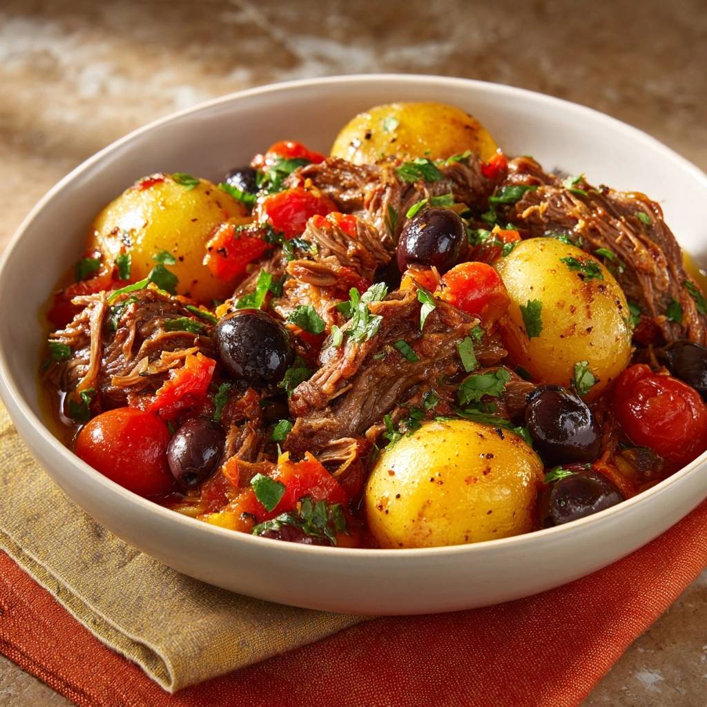 Zartes Pulled Rind mit Kartoffeln, Oliven & Paprika