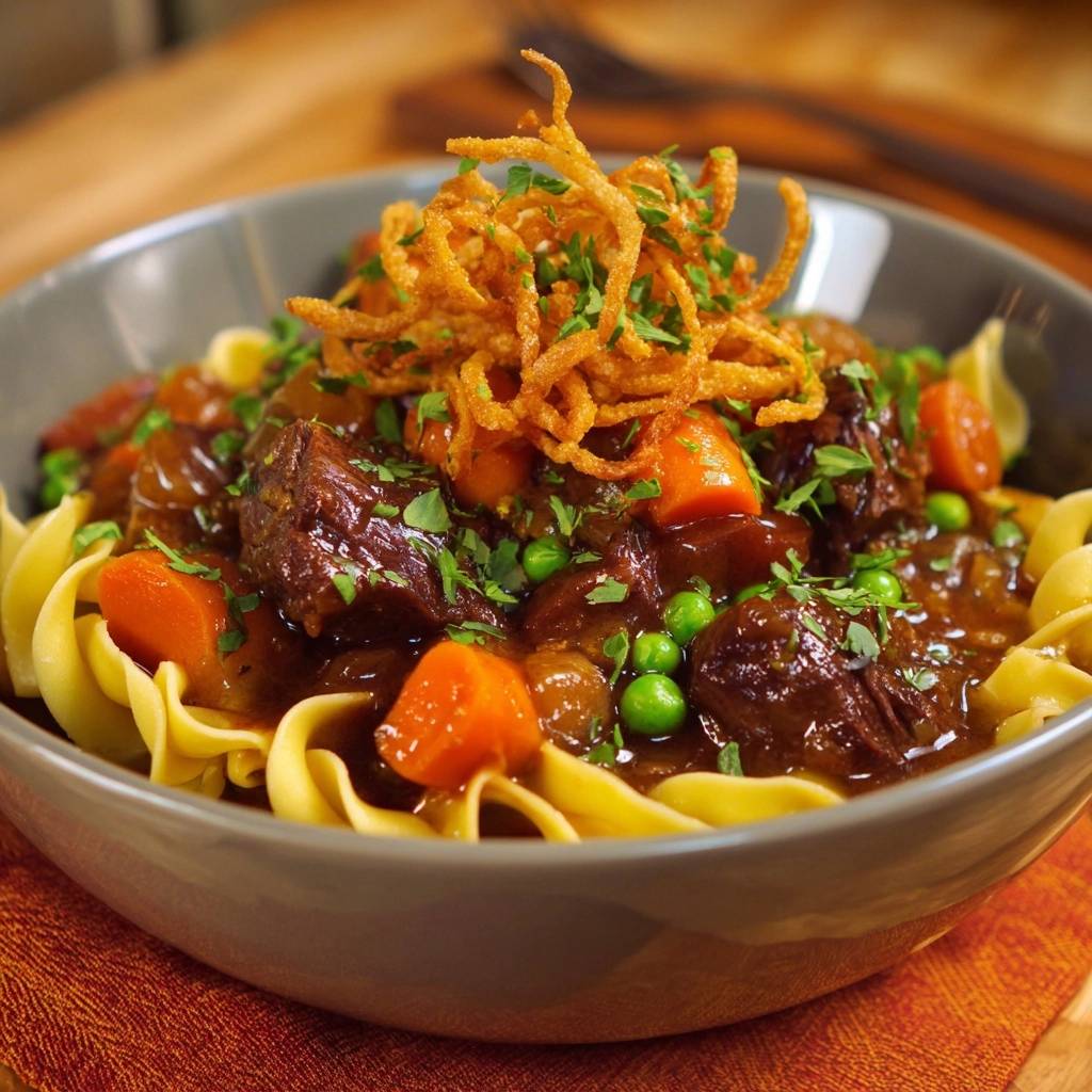 - Knusprige Zwiebeln obendrauf geben den perfekten Crunch – ein zartes Rindergulasch Rezept für jeden Tag.