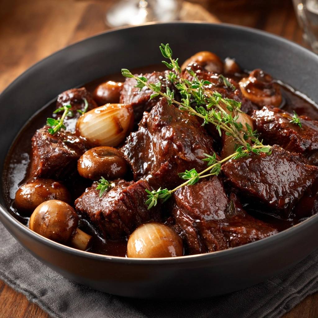 Stell dir vor, du nimmst die erste Gabel dieses Eintopfs in den Mund. Das Rindfleisch schmilzt förmlich auf der Zunge, umhüllt von saftigen Pilzen und süßlichen Perlzwiebeln. Der Thymian gibt genau den Hauch von Waldaroma, der alles abrundet.