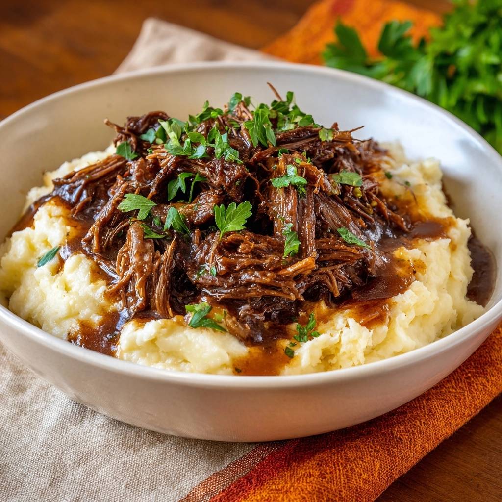 - Anrichten: Püree in Schalen verteilen, Rindfleisch und Sauce daraufgeben, mit Petersilie bestreuen. Guten Appetit!