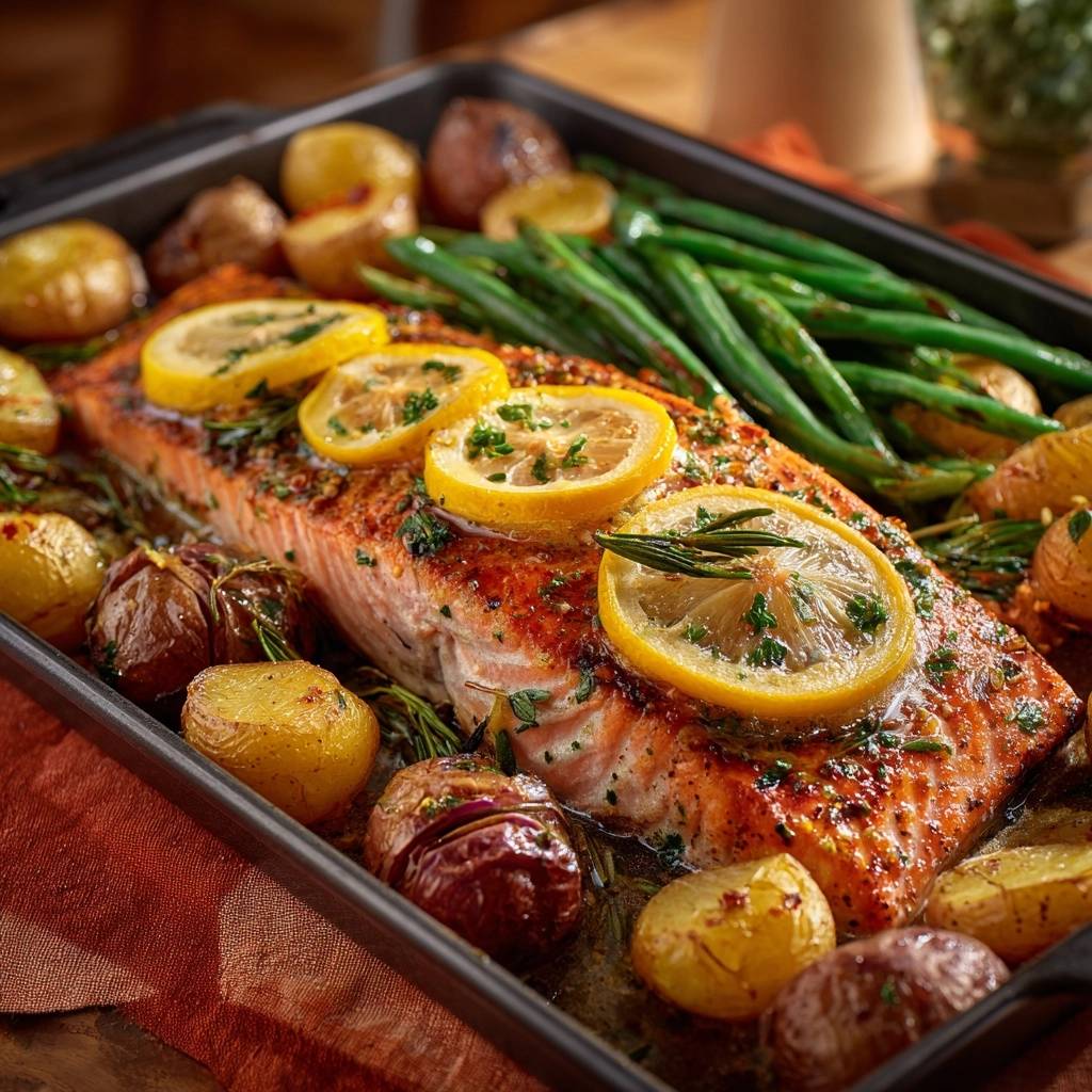 Du spürst die Feuchtigkeit im Lachs, weil das Öl und die Zitronen Dampf erzeugen. Die Babykartoffeln saugen Aromen auf, die Bohnen bleiben knackig. Fertig in unter 30 Minuten, ohne Chaos in der Küche.