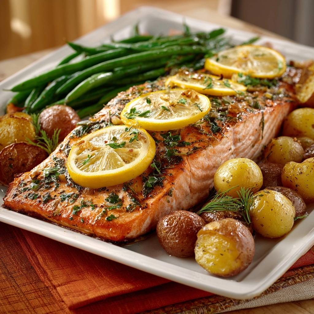 Stell dir vor, du beißt in diesen Zitronen-Kräuter-Lachs mit Babykartoffeln und grünen Bohnen. Der Lachs zergeht saftig auf der Zunge, die Zitronenaromen explodieren frisch und hell, während die Kartoffeln knusprig knacken. Der Dillduft hängt noch in der Luft, als wärst du am Meer.